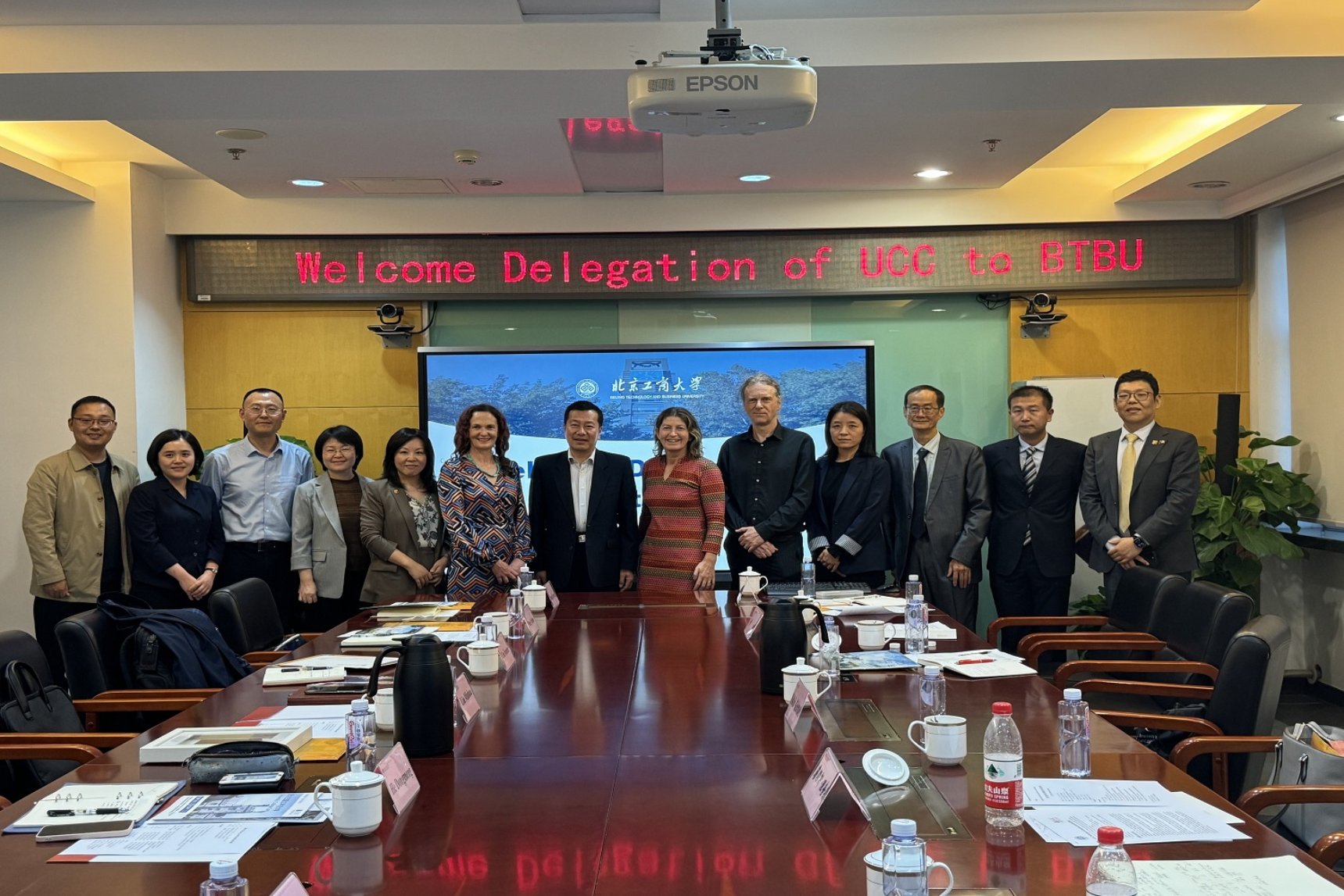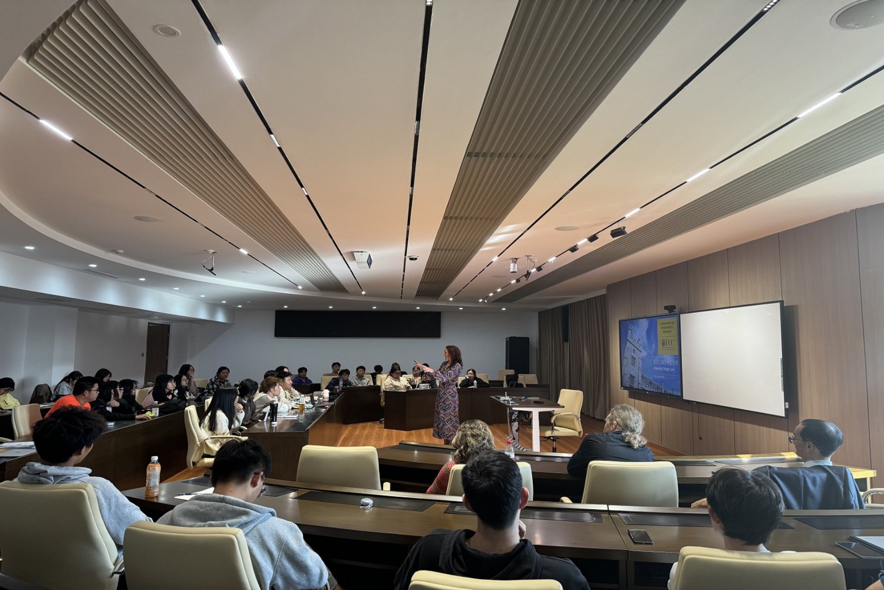 会谈前,厄休拉一行在阜成路校区为我校与科克大学中外合作办学项目班的学生进行了交流和座谈,对两校的合作项目进行了介绍并回答了学生的提问。