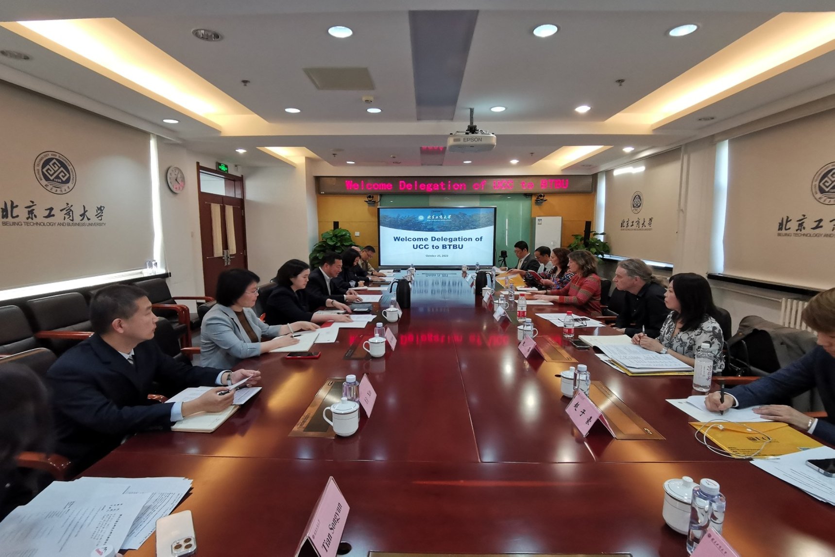 科克大学国际办公室战略官艾玛·康纳利(Emma Connolly)、生物地球环境科学学院与植物科学讲师詹姆斯·理查森(James Richardson)、数学科学学院统计学讲师黄健、北京代表处办公室主任张蓓,我校教务处处长刘艳楠、欧宝体育平台登录入口 与合作处处长贺冬萌、食品与健康学院院长王彦波、商学院院长何玉润、数学与统计学院副院长黄雪源、轻工科学与工程学院副教授李鑫参加了此次会谈。