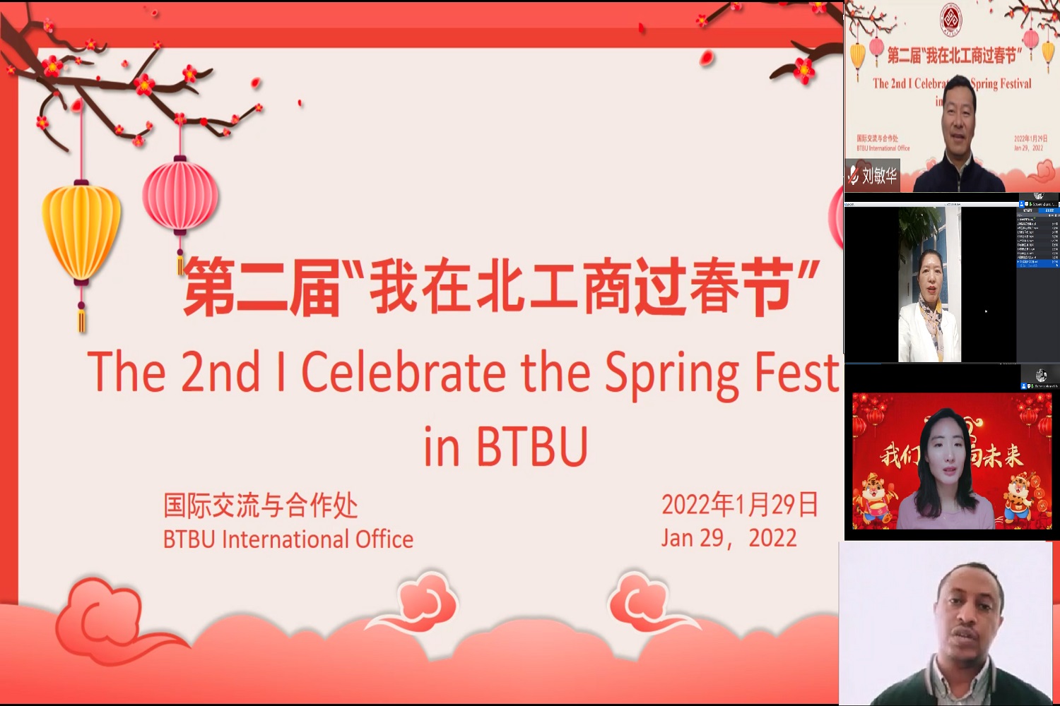 春节来临之际,为丰富留校国际学生的假期生活,增进他们对中国传统节日和习俗文化的了解,1月29日,学校举办第二届国际学生“我在北工商过春节” 线上活动,刘敏华副校长、欧宝体育平台登录入口 与合作处全体人员、部分留校国际学生参加了此次活动。