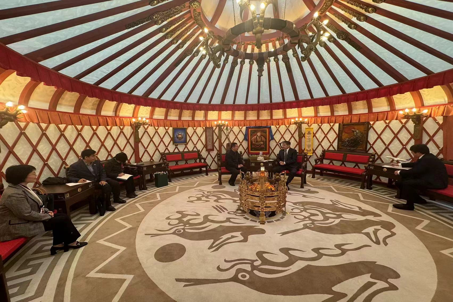 巴德尔勒大使对刘敏华来访表示欢迎,他说蒙中是山水相连的永久邻邦,是好邻居、好朋友、好伙伴。2022年,双方发表《中华人民共和国和蒙古国关于新时代推进全面战略伙伴关系的联合声明》,两国也一致同意将深化文化教育、科学技术、观光旅游等领域交流合作,大力开展人文交流,鼓励教育、科学机构之间推进合作,促进民心相通。今年是蒙中建交75周年,双方正在积极筹备形式多样的庆祝活动,增进“邻里心灵相通”。蒙中两国教育交流活跃,两国青少年通过各类不同的教育合作项目开展了广泛的交流,成为蒙中两国人文交流的重要组成部分。未来期待蒙古国高校能够和obao欧宝娱乐 建立相关合作,有更多蒙古国的优秀青少年来到obao欧宝娱乐 进行学习和交流。