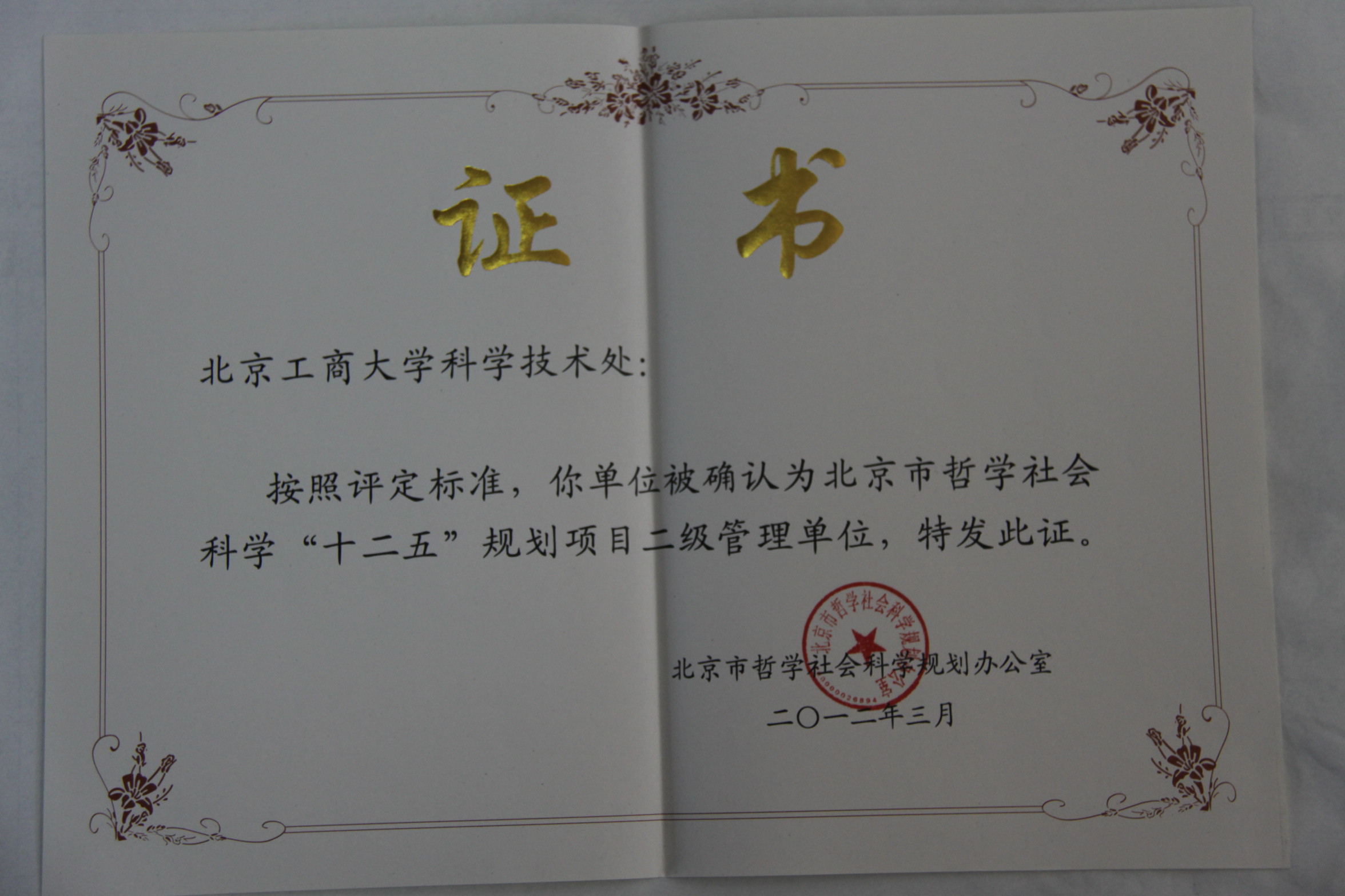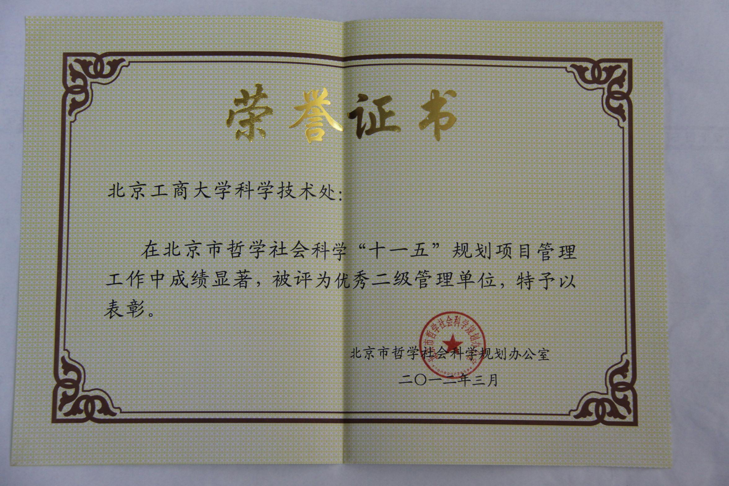 为落实《北京市哲学社会科学规划项目管理办法》确定的对市社科规划项目实行二级管理的要求,为不断提高二级管理单位的管理水平和履行科研管理职责的积极性、主动性和创造性,将承担“十一五”规划项目数在20项以上,项目管理认真、规范,按期结项率和最终研究成果优秀率较高的单位评为优秀二级管理单位。我校科学技术处达到各项标准,获评优秀二级管理单位,并且按照评定标准,被确认为北京市哲学社会科学“十二五”规划项目二级管理单位。