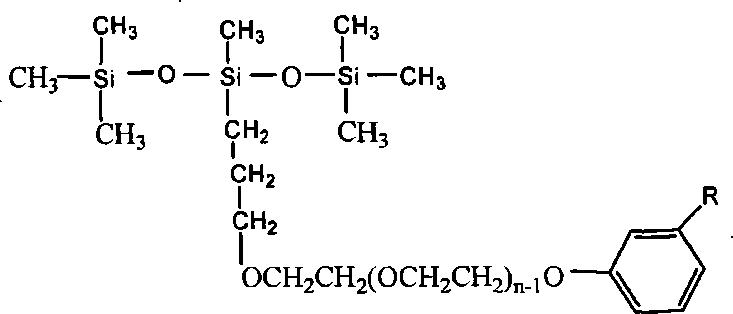 其中,R代表C15H31,n为2-20的整数。本发明提供了上述的含三硅氧烷的腰果酚醚型表面活性剂的制备方法。其制备方法是由氯丙基三硅氧烷与腰果酚聚氧乙烯醚反应,然后分离纯化 可得到含三硅氧烷的腰果酚醚型表面活性剂。本发明含三硅氧烷的腰果酚醚型表面活性剂同时具有含硅表面活性剂和腰果酚表面活性剂的性能特点,具有溶解性好,皮肤刺激性小,生物降解性优良;并能与其它表面活性剂配伍性好;可以得到不同环氧乙烷加成数的含三硅氧烷的腰果酚醚型表面活性剂,可做成乳化剂、润湿剂、增溶剂、洗涤剂等。