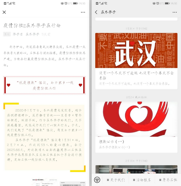 1月31日下午5点,我与组委会共同商讨后,我通过在外学子官方公众号推送了一篇题为《没有一个冬天不可逾越,也没有一个春天不会来临》的文章,以石柱在外学子志愿服务队的名义发出倡议,希望各位石柱籍在外学子能够奉献自己的一份心意,支援家乡、支援武汉、支援全国更好地打赢这场疫情攻坚战。