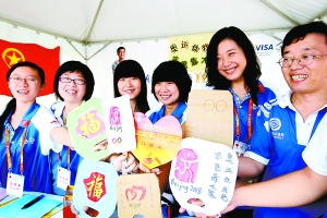 昨天,obao欧宝娱乐 嘉华学院奥运城市志愿者展示自制的“奥运扇”。这批画有中国印、奥运五环等奥运元素的扇子,是志愿者们利用废纸板制成。 本报记者 吴镝摄