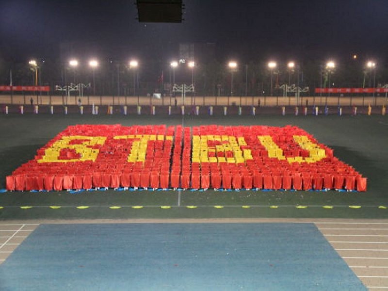 奏乐声起,校管乐团演奏的《勇往直前进行曲》响彻全场,操场的中央,法学院的一百名学生身着黄色服装,挥舞着各学院院旗和91个学生社团的旗帜,在灯光的照耀下,形成了一幅百旗飘扬的壮观景象。