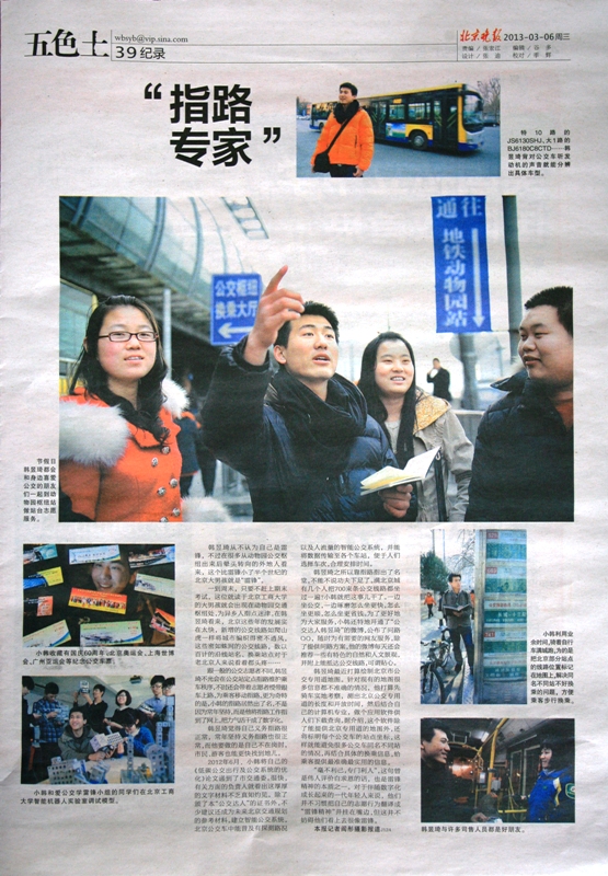 韩昱琦之所以靠指路指出了名堂,不能不说功夫下足了。满北京城有几个人把700来条公交线路都坐过一遍?小韩就把这事儿干了。一边坐公交,一边琢磨怎么坐更快,怎么坐更顺,怎么坐更省钱。为了更好地为大家服务,小韩还特地开通了“公交达人韩昱琦”的微博,公布了问路QQ,随时为有需要的网友服务。除了提供问路方案,他的微博每天还会推荐一些有特色的自然和人文景观,并附上能抵达公交线路,可谓贴心。