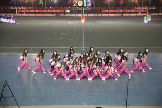 青春的节奏,让朝气蓬勃的大学生伴随着乐声在运动场上绽放出最美的年华。来自商学院、经济学院、艺术与传媒学院、计信学院以及材机学院的1008名大一女生踏着欢快的啦啦操歌曲惊现“舞台”。她们身着红色和黄色制服,高举手花,用各式各样的队形淋漓尽致地展现着“巾帼不让须眉”的气魄。长久的期盼在此刻化作了自信的笑容洋溢在每一位同学的脸上,她们用年轻人的青春蓬勃绘出了一幅又一幅壮美的画卷:“小飞机”、“2013”、“花团锦簇”不断地展现在观众的视野中。指导教师王立红说,团体操的训练让同学们都参与到了体育锻炼中,看到大家这样辛苦训练的成果在此刻展现,我们真正做到了为自己加油。