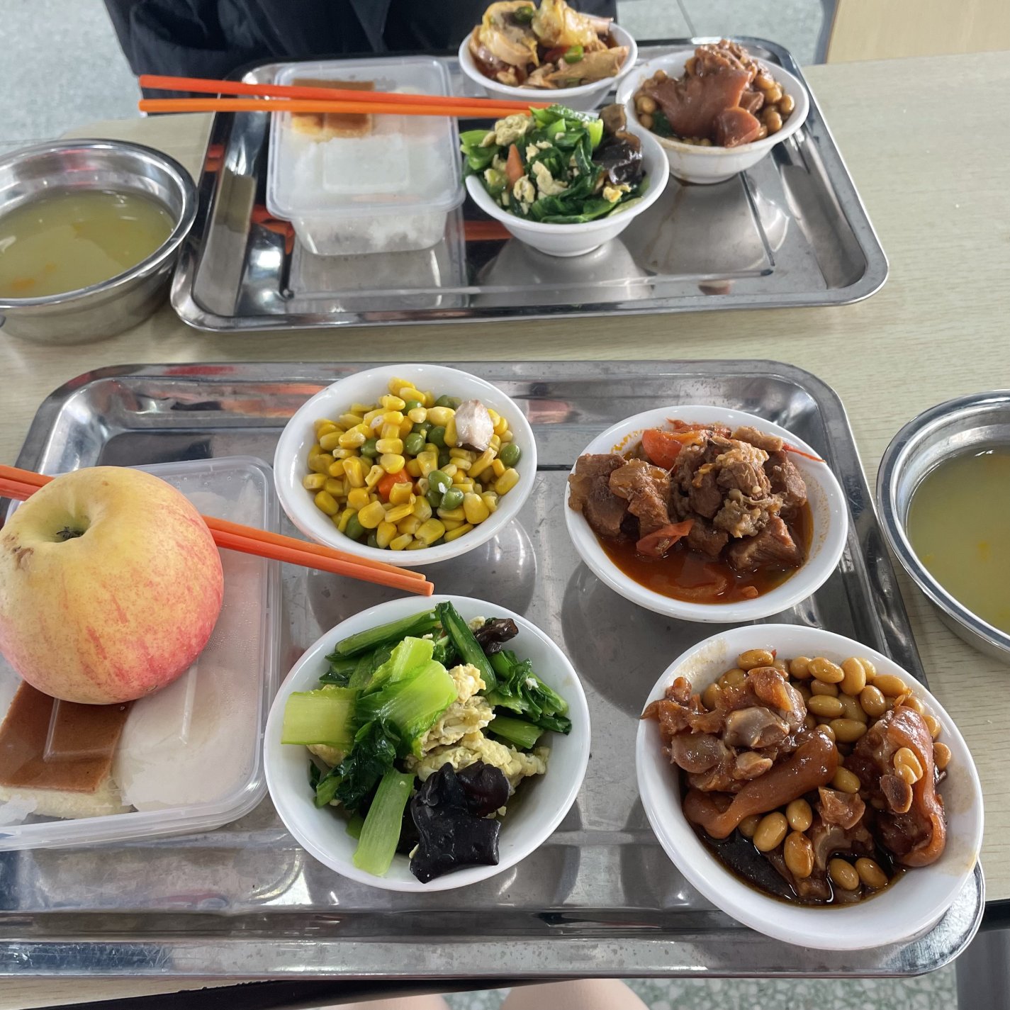西红柿牛腩、黄豆烧猪蹄、清炒玉米粒、油菜鸡蛋,外加一个苹果……大年三十当天,obao欧宝娱乐 食品与健康学院研三学生金燕京在食堂享用了免费午饭和晚饭。