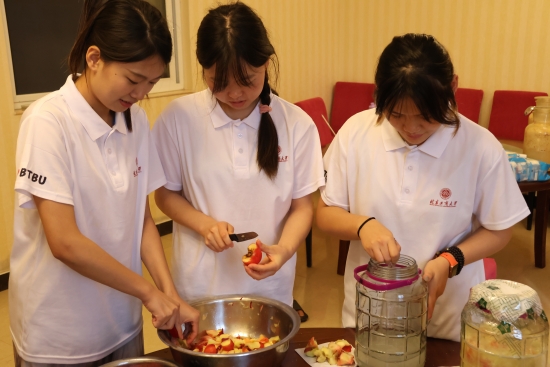食品与健康学院暑期社会实践团深入平谷区大华山镇,充分发挥团队成员各自专业优势,以专业素养完成桃酒实验设计,原料处理,数据记录,数据分析等工作,打造成果转化应用场景。同时积极参与“村课、村播、村晚、村耕”活动,发挥桥梁纽带作用,推动校地共建。真正做到在学习中拓宽视野,在实践中增长才干,全力为大华山高质量发展和高大尚平谷建设贡献青春力量,推动产学研合作,促进科技成果转化,实现科技助力乡村振兴。项目的实施不仅有助于传承与发扬小裕子村独特的酿酒文化,提升品牌影响力,还能通过科技助力促进产业发展与乡村振兴,提升产品品质,拓宽市场渠道,增加村民收入,进一步推动乡村经济发展,并通过深入研究为新的发展理念下乡村酿酒产业的可持续发展、产品品质提升、市场渠道拓宽以及乡村经济发展水平的提高做出积极贡献。