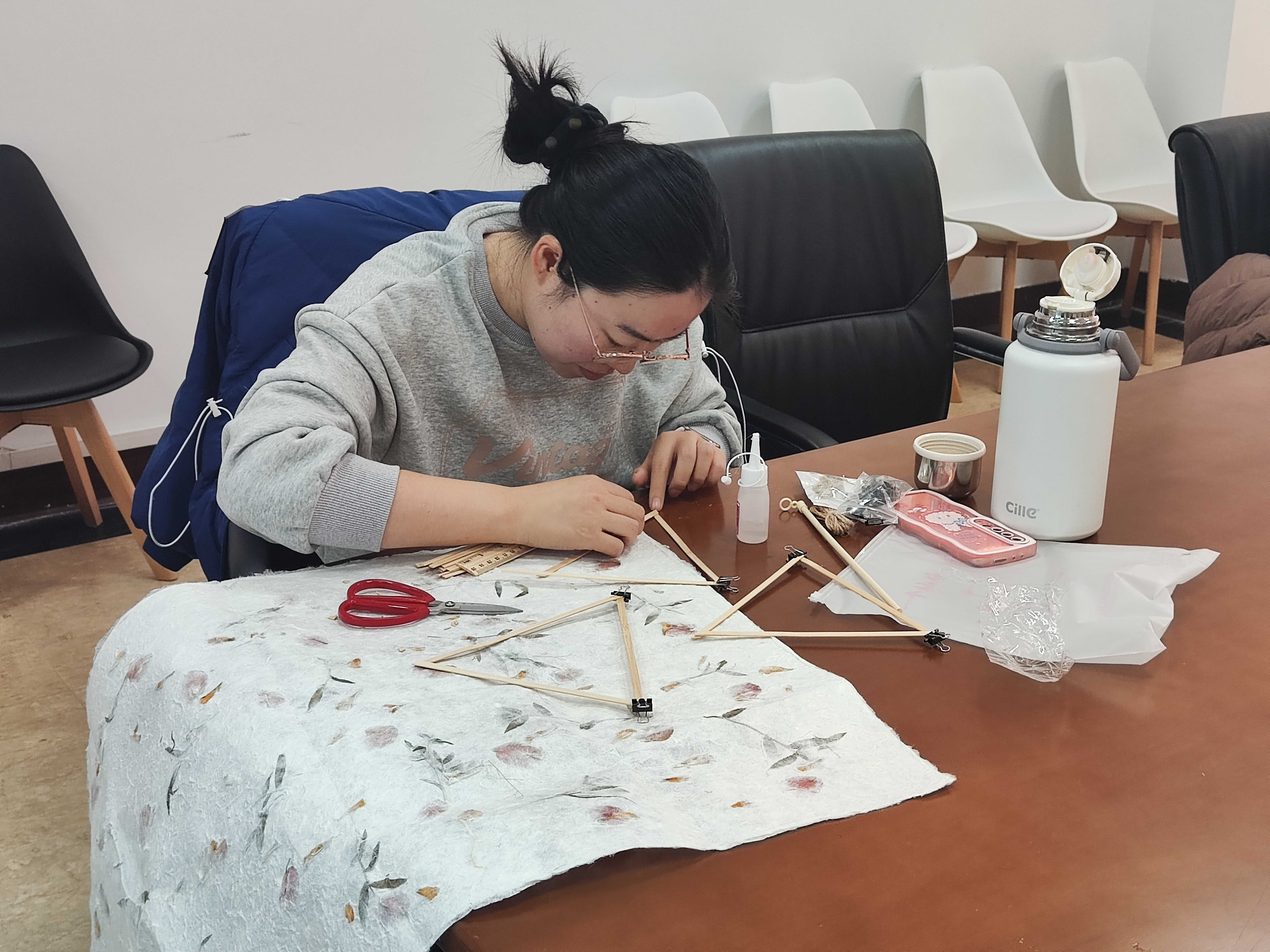 花草灯是当代花草工艺与传统灯笼技法相结合的一种艺术装饰品,有祝愿、祈福等特殊意义。活动中,小图工作室的同学先向大家讲解了花草纸工艺的历史以及花草灯的制作背景。随后,在示范者的带领下,同学们开始自己动手制作古风宣纸花草灯。修剪竹篾、搭建灯架,粘合灯面,绑上提绳,同学们互相帮助,有效配合,尽情享受手作乐趣;历经定型、裁剪、粘合等步骤,一盏盏花草灯逐渐成形,大家争相拍照合影留念。