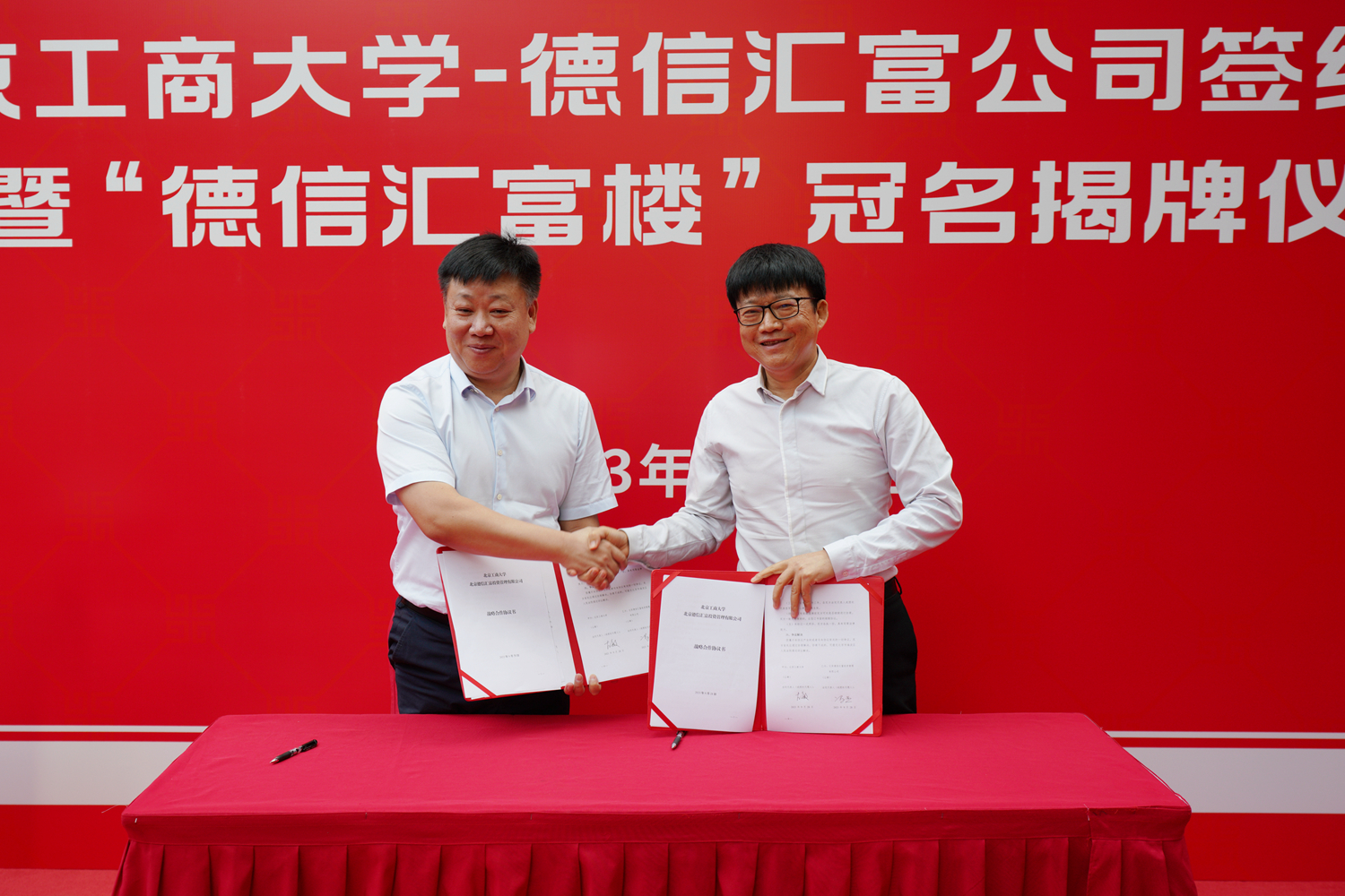 秋高气爽,佳节将至,9月28日,obao欧宝娱乐 -德信汇富公司战略合作签约仪式暨“德信汇富楼”冠名揭牌仪式在阜成路校区举行。校党委副书记、校长郭建华,党委常委、副校长、教育基金会理事长徐丹丹,党委常委、副校长、校友会会长左敏,83储运专业校友、北京德信汇富投资管理有限公司总裁冯亚出席仪式。仪式由徐丹丹主持。