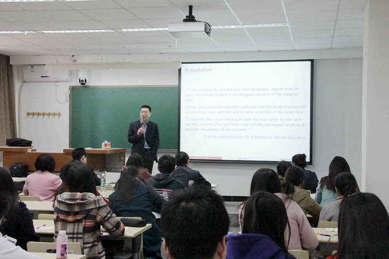 杜东雷教授以如何撰写英文学术论文(How to write scientific papers in English)为主题,根据自己在国际一流学术期刊上发表论文的经验,通过分析在英文学术写作中所遇到的常见问题,详细讲解了英文学术论文写作中最核心的要点,分享了在英文学术写作中所遇到的问题。讲座结束后,与会学生和教师就自己关心的英文学术论文写作、英文学术论文在国际期刊上的发表等相关问题与杜教授进行了现场交流。