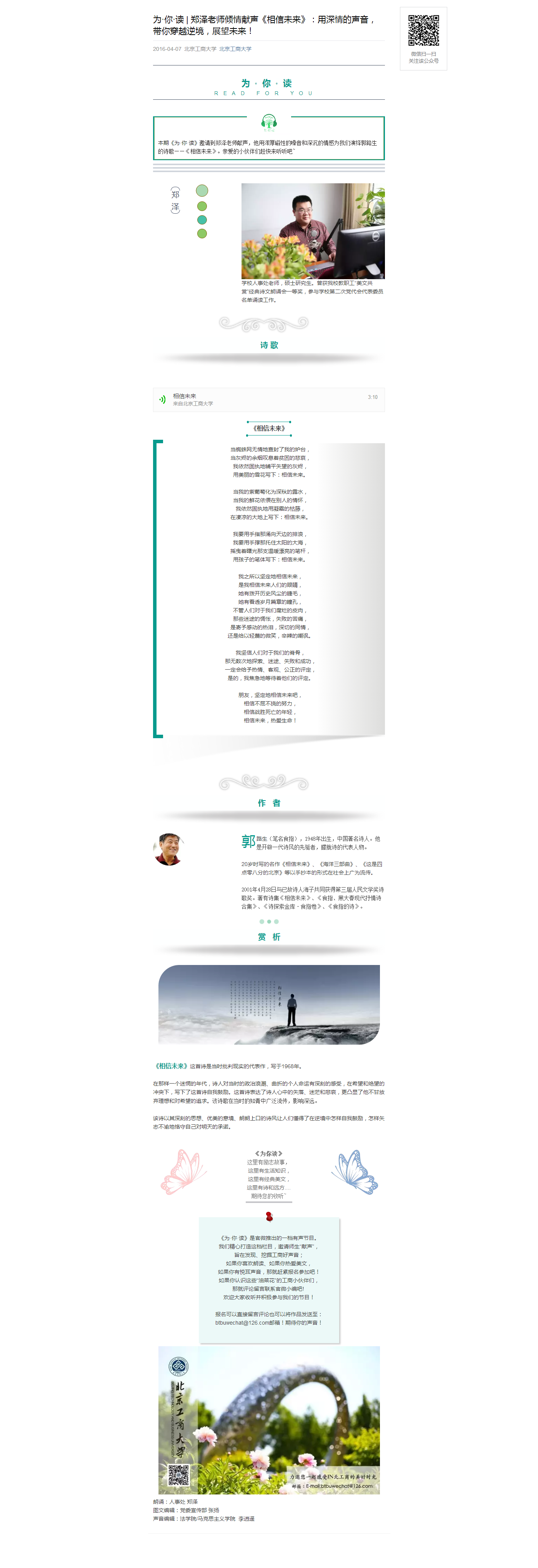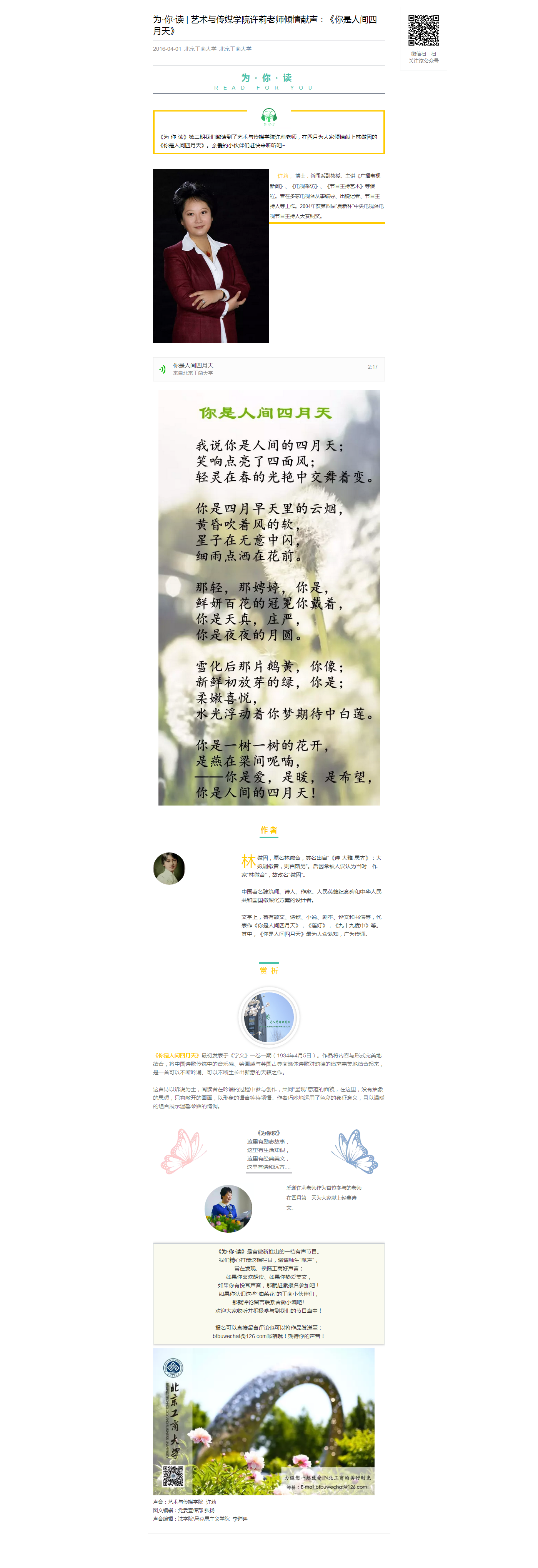 《为·你·读》栏目选取经典诗词、散文,邀请喜欢朗诵、热爱美文的师生进行朗读,制作后通过文字、声音、图片立体传播方式,将经典诗歌、散文推送给广大师生,与师生分享读书的快乐,感受朗诵的愉悦。图文同时还对经典作品的内容进行解读,介绍诗词作者,借助微信平台传播量大、受众关注广泛的特点,带动师生阅读经典、朗诵经典、传播经典,享受经典之作的滋养。平台通过作品、朗诵人征集,发现、挖掘工商好声音,为师生提供展示才华的平台,增强与师生的互动。