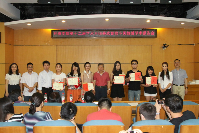 颁奖仪式后,梁小民教授为师生们带来了题为“经济学与读书”的精彩报告。作为“学术月”的压轴学术报告,梁小民的讲座处处体现出大家风范,深入浅出,风趣幽默。他从为什么要读书讲起,旁征博引,论述了读书的重要性。他特别谈到,读书对于年轻人来说尤为重要,是为以后的成功打好坚实的基础。梁小民还分析了应该怎样读书,读书可以分为“精读”和“泛读”,对学习的基础教材要精读,对一般的书籍可以泛读。梁小民为师生推荐了10本经典书目,并就如何读书、如何学习外语等问题与师生进行了交流和讨论。整场讲座掌声和笑声此起彼伏,师生们深受启迪,意犹未尽。