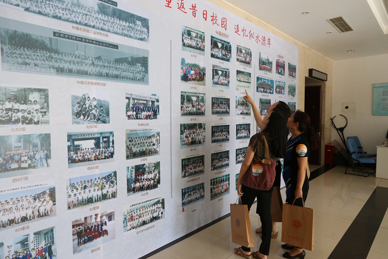 东区礼堂前厅的怀旧照片展览格外引人注目。1986届、1996届和2006届校友的老照片,跨越30年、20年、10年的时空,把校友们的思绪带回了青春。大家纷纷来到照片墙前,寻找当年的照片并合影留念。学校在两校区分别设置了欢迎背板和拍立得,方便校友合影留念。