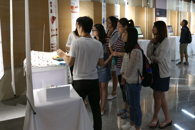 简短的开幕式后,与会嘉宾饶有兴致地观看了各展区的展览。在新闻系的展区,学生在《北京青年报》等纸媒实习的“报刊实习作品”,以及在北京电视台、乐视等实习的“视频实习作品”等,无不彰显了学院经济新闻的特色方向。广告系的展区内,最具代表性的作品是广告系09级同学的一则“士力架”品牌户外广告,该作品曾获首届中国OOH青年广告创意大赛的金奖。视觉传达系的展区内,一件件精美的作品在展桌上依次排开,展示了艺传学子的创新思维和学术理解能力,其中最为吸引眼球的是一组“四时八节”插画,作者借方圆组合的构图方式体现了古人天圆地方的思想。数字媒体系的作品主要是学生独立制作的影片和动画,现场展示的影片均是校内取景,同学们自制道具、自己扮演和制作后期特效,极具好莱坞大片影效。产品设计系学子曾获包括国际设计大赛IF奖、红点奖、中国创新设计红星原创奖等在内的多个设计奖项,本次展出了活动母婴室、F1冠军赛车原型等众多实物作品。