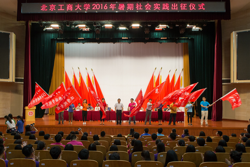 在国歌声中,出征仪式拉开帷幕。团委书记王海伟介绍了我校2016年暑期社会实践基本情况。今年我校开展以“青年服务国家——投身助力十三五,青春奋进中国梦”为主题,以理论学习、政策宣讲、基层建设、走访调研、志愿服务为主要形式的暑期社会实践。本次实践分为集中实践和分散实践。集中实践包括“十乡百村千人行”暑期社会实践团、房山区暑期高校大学生社会实践团、“社区青年汇新青年学堂”成人高考培训实践团、思想教育主题实践团、暑期大学生志愿服务实践团,赴英国牛津大学学生培训实践团以及服务腾冲暑期联合社会实践团等七个团队。其中青年志愿者协会敬老爱老志愿服务团和服务腾冲暑期联合社会实践团还入选了北京市暑期社会实践百强团队。王海伟表示今年是十三五规划的开局之年,希望将社会实践打造成第二课堂的育人品牌,引导帮助更多学生在实践中成长。
