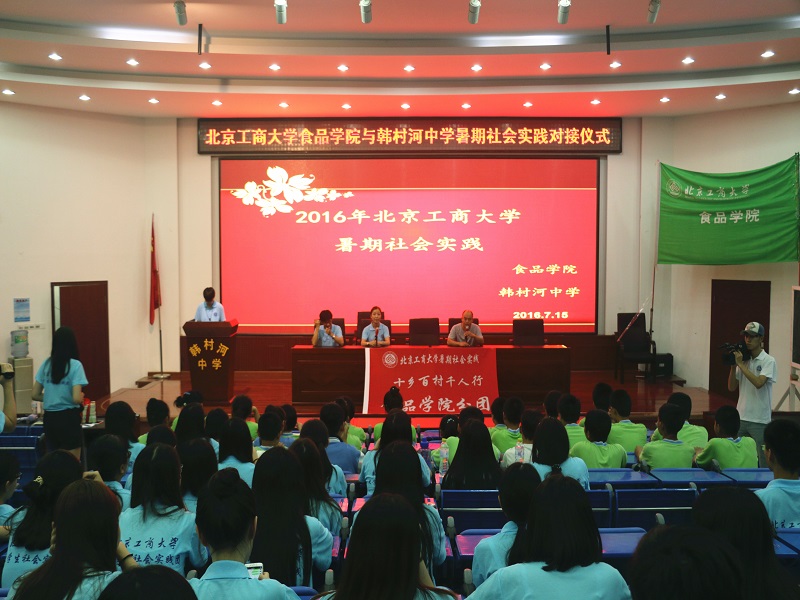 7月15日,食品学院实践分团全体师生怀着饱满的热情来到房山区韩村河中学,开始了食品学院第12个年头的暑期社会实践活动。到达后,实践团与韩村河中学举行了2016年暑期社会实践对接仪式。仪式由韩村河中学德育办公室甄主任、食品学院团总支书记刘晶老师、王钊老师及两校学生参加。