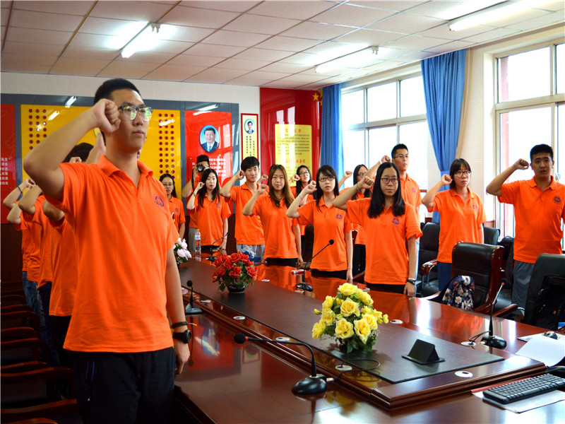 实践团团员在团旗下庄严宣誓:“践行志愿精神,服从组织,顾全大局,帮助他人,乐于奉献,树工商典范,展青春风采,携手石中,共创法制中国梦。”