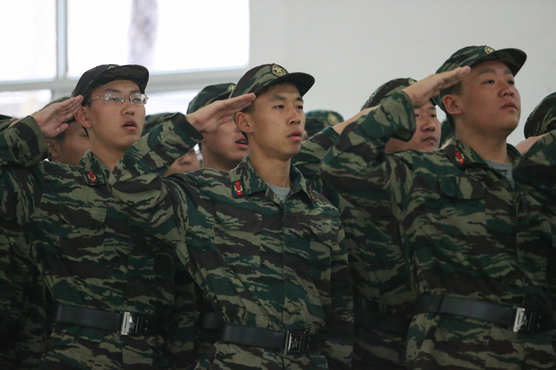 无论是教官还是队员都非常重视这两场比赛,每个连参加比赛的同学都是从自己的连队里挑选出来的精英,他们是各连风貌的代表。大家无惧恶劣的天气,跟随教官在楼道里加紧训练,并努力把动作做到位,整齐划一。由于天气原因,会操表演和歌咏表演都是在室内举行的。虽然地面有水,有些滑,但教官和老师们根据场地减去了一些脚步的动作。比赛之际雨下得很大,但再大的雨也无法消磨同学们的积极应战。同学们自信的步伐、整齐的队列、快速的反应、标准的动作和洪亮的口号,展现了初步训练的成果,也一次次赢得了场下同学的掌声。而歌咏比赛,大家也都精神抖擞、神采飞扬,嘹亮的歌声响彻全场,动人的演绎展现了同学们对军人的敬意。经济学院的王雪菲谈到:“那天下雨大家都解散了,后来雨小了点,我们队列班的又出来训练,虽然很辛苦,但是努力还是有回报的。感觉很有成就感。”