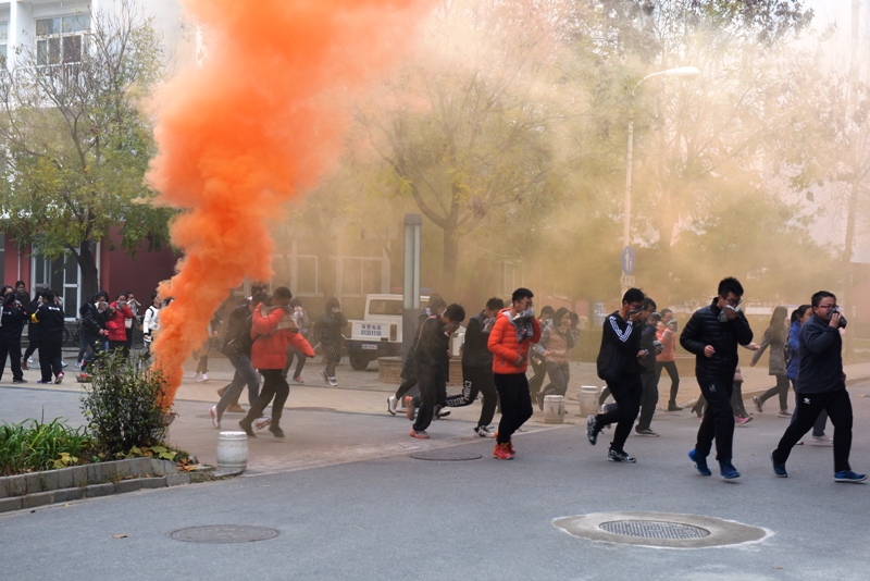16:30,随着张耘副校长的一声令下,消防演习正式开始。此时,8号楼警报鸣响,烟雾滚滚,800余名新生分别从各自宿舍迅速而有序地疏散到集结区域。参演学生根据在消防培训中学到的知识,以毛巾掩住口鼻,弯腰快步地从烟雾中撤离到指定地点。模拟现场非常逼真,疏散过程紧张而有序。现场还设置了消防逃生体验帐篷、高空云梯救援、体验穿戴消防战斗装备等。消防战士还讲解和示范了灭火器使用方法。随后,保安人员点燃了火堆,参演的师生亲身体验了用灭火器灭火的实际操作,取得了良好的演练效果,也达到了预期的教育目的。