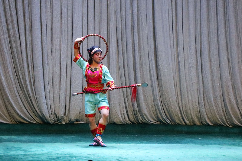 演出持续了近两个小时,包含昆曲、京剧、河北梆子等经典剧目,演员们精湛的演技、华美的服饰、专业的唱腔赢得了学生们的阵阵叫好和掌声,也使同学们深深感受到了戏曲文化的博大精深。在互动环节,中国戏曲学院的老师现场教学生水袖舞、走矮子、穿戏装等,学生们积极参与,踊跃上台学习,零距离体验戏曲的魅力。