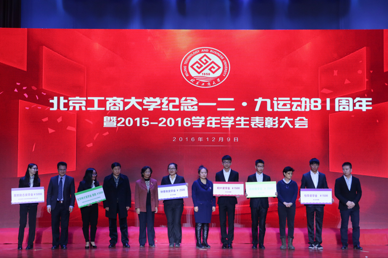 为弘扬伟大的爱国主义精神,表彰先进,12月9日,学校在良乡校区召开纪念一二·九运动81周年暨2015-2016学年学生表彰大会,表彰了6类获得市级以上奖项的学生集体、个人和学校十佳班主任。学校党委书记谭向勇、副书记张德玉、副校长李朝鲜、方德英、纪委书记邱晓平、党委副书记董竹娟出席活动。各学院党政领导、市级获奖学生代表、16级本科生代表以及特邀嘉宾社会奖学金资助方代表一同参加活动。