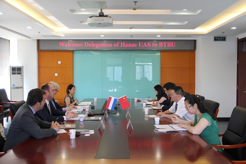 6月19日下午,荷兰格罗宁根汉斯应用科技大学副校长罗博·福斯达(Rob Verhofstad)一行4人访问我校,李朝鲜副校长在阜成路校区亲切会见了代表团一行。