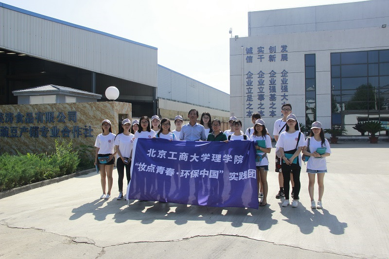 在北京味食源有限公司,实践团成员在公司负责人带领下,参观了生产车间和研发中心,对食品香精香料的生产工艺流程进行了初步了解。在参观过程中,同学们深刻感受到了自动化生产带来的高效率,同时,结合本次实践环保主题,对生产过程中的废水、废气、废料处理和回收等问题展开了积极讨论学习。
