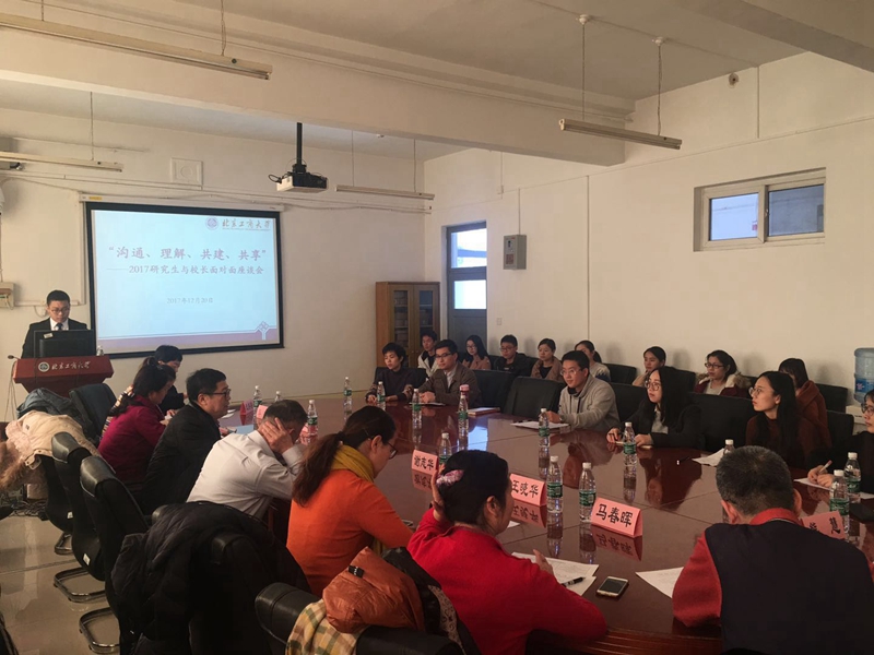 为了更好落实党的十九大会议精神,改善学校研究生教育管理服务,促进研究生全面发展,提升研究生培养质量。12月20日,研工部召开了以“沟通、理解、共建、共享”为主题的座谈会,邀请校领导、相关职能部门领导老师与研究生代表们面对面谈问题谋发展。学校副校长谢志华参会并讲话。参加座谈会的有研究生院院长兼研工部部长杨德勇、国有资产管理处处长王晓华、图书馆馆长马春晖、后勤基建处副处长杨会如、研究生院副院长兼研工部副部长熊慧以及职能部门、研究生院老师和研究生代表共计30人。