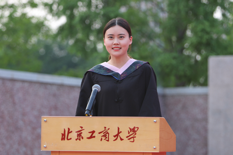国家奖学金及第一届校长奖学金获得者、外国语学院英语142班退伍学生韩琛,与同学们一同回顾了从大一到大四的成长历程和自己的满满收获,代表2018届全体毕业生向辛勤培育学子的各位领导、老师表达最衷心的感谢,向多年来辛勤操劳的父母表示最崇高的敬意,向朝夕相处的兄弟姐妹们表达最诚挚的祝福,并表示2018届全体毕业生将永远珍藏在北工商的绚丽记忆,以“求真、立德、勤奋、创新”的校训作为动力,不忘初心,不懈奋斗。