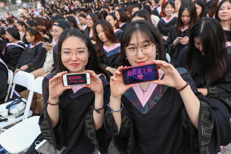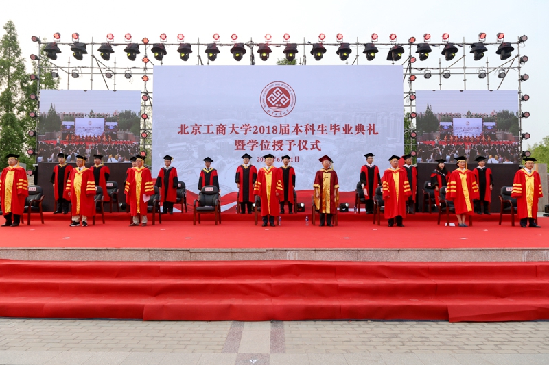 伴随着激昂的乐曲声,学位授予仪式开始。脸上洋溢着自信的笑容,散发着青春气息的毕业生们依次走上主席台,由校领导和学位委员会委员为他们扶正流苏、授予学位,并合影留念。当学位帽上的流苏被从右到左轻轻拨过,2018届毕业生从师长手中接过大学时光不懈耕耘的收获,对着镜头留下大学四年最美好的青春记忆,为求学历程划上圆满句点,去迎接未知的精彩未来。从此,北工商又添校友;从此,聚散心系母校。