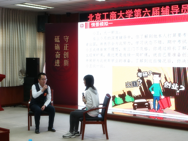 辅导员素质能力大赛是我校落实全国及北京高校思政工作会议、教育工作大会精神的重要举措。以赛促学,我校已经成功举办了六届辅导员素质能力大赛。大赛的赛制、要求也在根据实际情况不断调整和提高。本年度大赛,充分考虑了辅导员日常工作业绩,由学院评选出20名年度优秀辅导员参加比赛。大赛共分为两个部分,第一部分为笔试,重点考核辅导员对于习近平新时代中国特色社会主义思想、马克思主义基本理论以及学生工作实务的掌握情况。笔试前十名,作为年度十佳辅导员进入第二部分即现场赛环节。现场赛分为理论宣讲和情景模拟两个比赛单元。