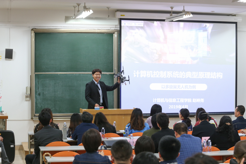 决赛现场,每位参赛选手都通过20分钟的课堂教学演示,展现了自己扎实的教学基本功和新颖的课堂安排。文科组来自商学院的仇勇老师,从大家关注的“五一假期”导入,为在场听众讲解了法定假期与加班工资的测算,语言风趣幽默,富有亲和力。文科组来自艺术与传媒学院的邓莹洁老师,通过形象生动的教学展示和设计独特的现场互动,为“外国留学生”讲解了汉语的语法与用法。理工科组来自计算机与信息工程学院的赵峙尧老师,在轻松风趣的语言和灿烂的笑容中,运用多旋翼无人机实体道具,为大家生动形象地介绍了计算机控制系统的典型原理结构。理工科组来自计算机与信息工程学院的孙茜老师,通过电梯和机床台的视频引入主题,为在场听众讲解了三相异步电动机正反转控制电路的原理,课件精美,举例恰当。