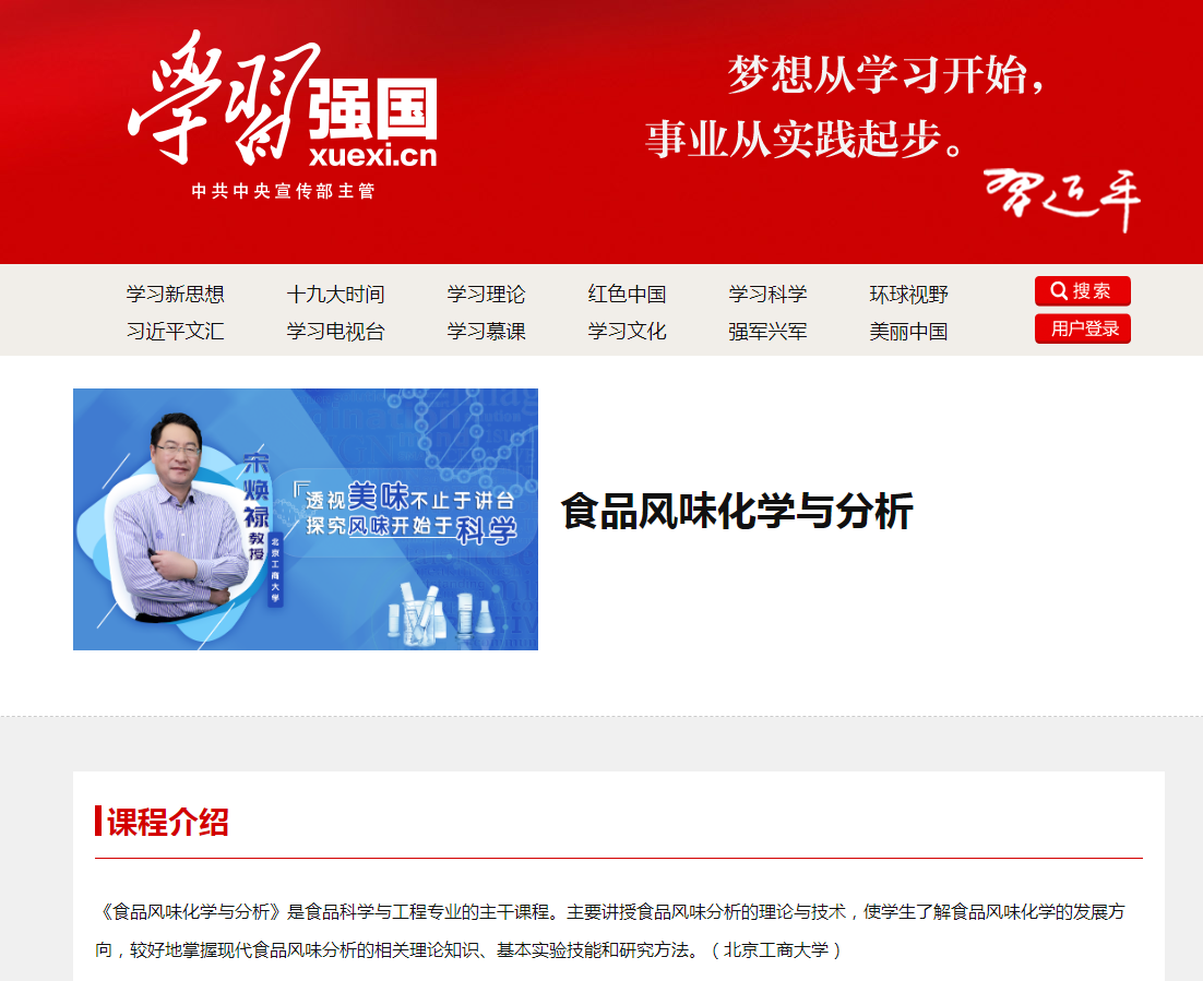 7月31日,我校慕课课程《食品风味化学与分析》成功入选“学习强国”平台“学习慕课”栏目,以供全国九千多万党员和广大社会群众在线学习。该课程由我校研究生院立项建设,食品与健康学院宋焕禄教授团队设计开发,供研究生和本科生及相关人员在线学习,是我校首批上线的慕课课程。 《食品风味与化学》课程是食品科学与工程专业的主干课程,主要讲授食品风味分析的理论与技术,通过多种食品风味分析实验案例的讲解提高学生技术应用能力,为从事食品风味及其分析相关工作打下坚实的理论与实验基础。该课程于2018年底正式在学堂在线平台上线,目前选课人数已达到1.5万人,深受广大学习者的喜爱和好评。 “学习强国”学习平台是由中宣部主管,以习近平新时代中国特色社会主义思想和党的十九大精神为主要内容,建立纵向到底、横向到边学习网络,实现有组织、有指导、有管理、有服务的学习,是立足全体党员、面向全社会的多元化优质平台,具有重要的代表性和影响力,对入选课程有很高的政治性、学术性要求。《食品风味与化学》的成功入选体现了我校高水平的教学和高质量的课程内容,既是对优秀教育风采的展示,也是社会对我校教育水平的认可。