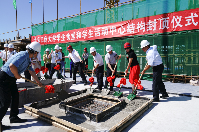 8月30日上午,16-02-01地块学生食堂和学生活动中心项目主体结构封顶仪式在良乡校区二期新建工程工地现场隆重举行。学校党委书记黄先开,校长孙宝国,副校长张耘、方德英,中国新兴建设开发有限责任公司党委书记沙吉培、建研凯勃建设工程咨询有限公司副总经理崔建永、中国中轻国际工程有限公司副院长何嘉欣、中竞发工程管理咨询有限公司副总经理沈毅出席仪式。学校相关部门代表、师生代表及参建单位代表等50余人参加了封顶仪式。仪式由副校长张耘主持。