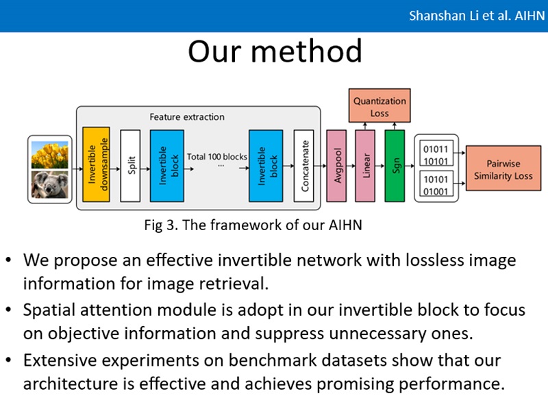 本次会议共收录论文183篇,主要包含计算机视觉、图像分析、图形学等方面的最新研究进展,最终选择33篇论文口头报告,并从中评选出两篇最佳论文和两篇最佳学生论文。我校计算机与信息工程学院媒体计算实验室计算机科学与技术专业2018级研究生李珊珊同学的论文《Attention-aware Invertible Hashing Network》经过评委团综合论文评审和现场报告、提问等多个环节,最终获得最佳论文。论文指导教师为蔡强教授,该论文提出一种新颖的基于注意力机制的可逆散列网络(AIHN)用于图像检索。通过其中的可逆特征表示,从输入图像计算得到的哈希码不会丢失任何图像信息,同时采用注意力机制突出关键信息区域,提升泛化能力,实验结果与其他常用算法对比,均获得不同程度的性能提高。