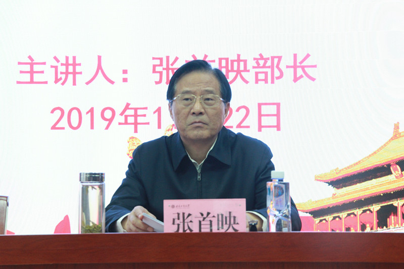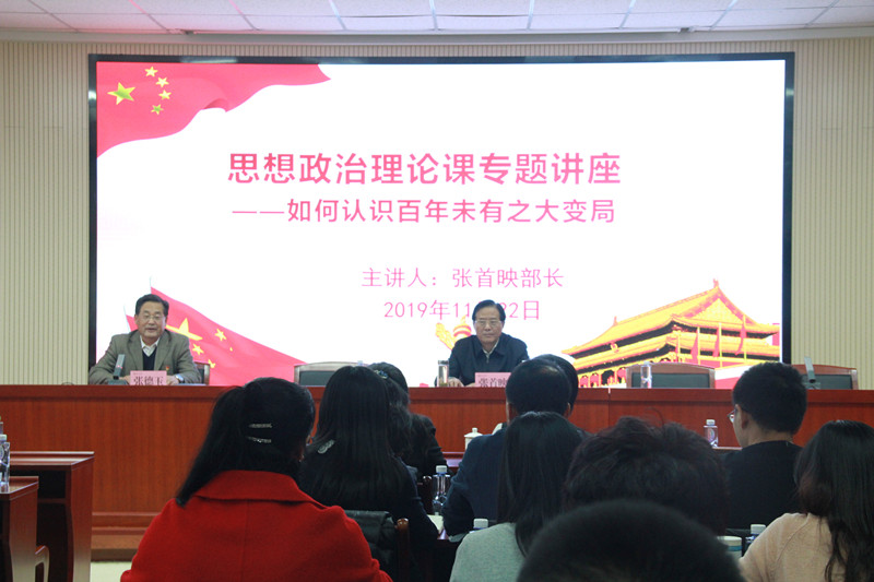 11月22日下午,人民日报社副总编辑张首映应邀为马克思主义学院师生和全校研究生党团骨干讲授以“如何认识百年未有之大变局”为题的“部长进校园”思想政治理论课专题讲座。讲座由校党委副书记张德玉主持。讲座开始前,校党委书记黄先开、副书记张德玉与张首映一行进行了交流。