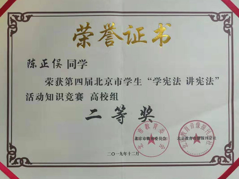 法学院法学183班陈正俣代表学校参加全国学生“学宪法讲宪法”北京赛区(高校组)知识竞赛。本次北京赛区的知识竞赛活动分为宪法知识比试,现场面试两个环节。陈正俣灵活运用所学宪法知识,结合平时实践实习的积累,在有限的时间里取得了优异成绩。