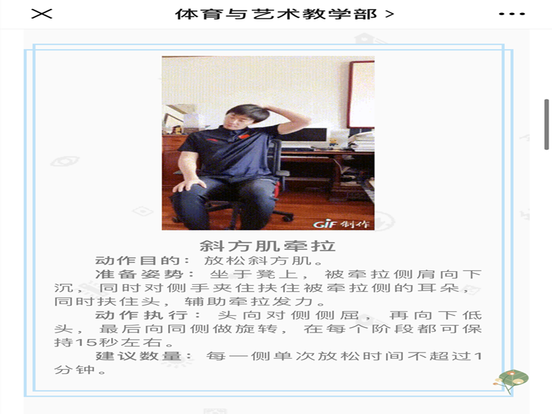 在这场没有硝烟的战争中,提高自身免疫力是抵抗病毒的最好武器。长期居家,长时间使用电子产品,缺少活动,不仅影响身体健康,还容易引发负面的情绪。针对想锻炼,缺乏场地器材的情况,体育与艺术教学部的老师们,精心制作了一系列居家锻炼视频,设计出了一套合理的锻炼指南。该系列视频包含了体能素质训练、肌肉放松拉伸训练、太极拳步伐、体育舞蹈等。现已在体育与艺术教学部公众号(微信公众号搜索体育与艺术教学部即可关注)上发布推广,欢迎广大师生阅读参考。