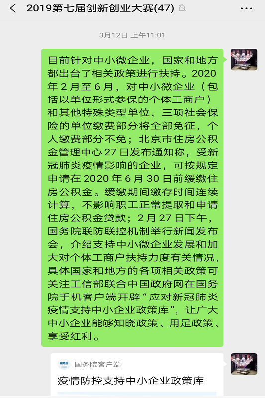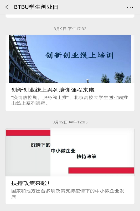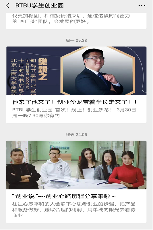 疫情期间,通过创业园微信群等方式积极与团队沟通交流,线上调研同学们的相关需求,积极关怀在湖北的学生,积极搜集整理疫情下国家和北京市的创业支持政策,并开展了“创业说”---创业者心路历程分享活动,采取线上公众号推文的形式,将创业园优秀入驻团队负责人的创业心路历程和经验分享给同学们,让同学们了解大学生创业的历程,从文字中体会创业者的创新与拼搏精神。
