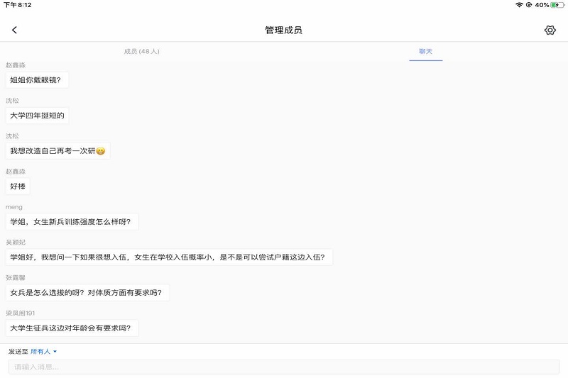 参加讲座的除毕业生外,还有很多怀心怀戎装梦的低年级学子,大家全程在留言区积极提问,与主讲人、分享人互动,大家对体检标准、征兵性别比例、优抚政策、部队生活、训练强度、今后发展、考研就业前景等内容提问,许峰对各位校友进行了细致耐心的解答。