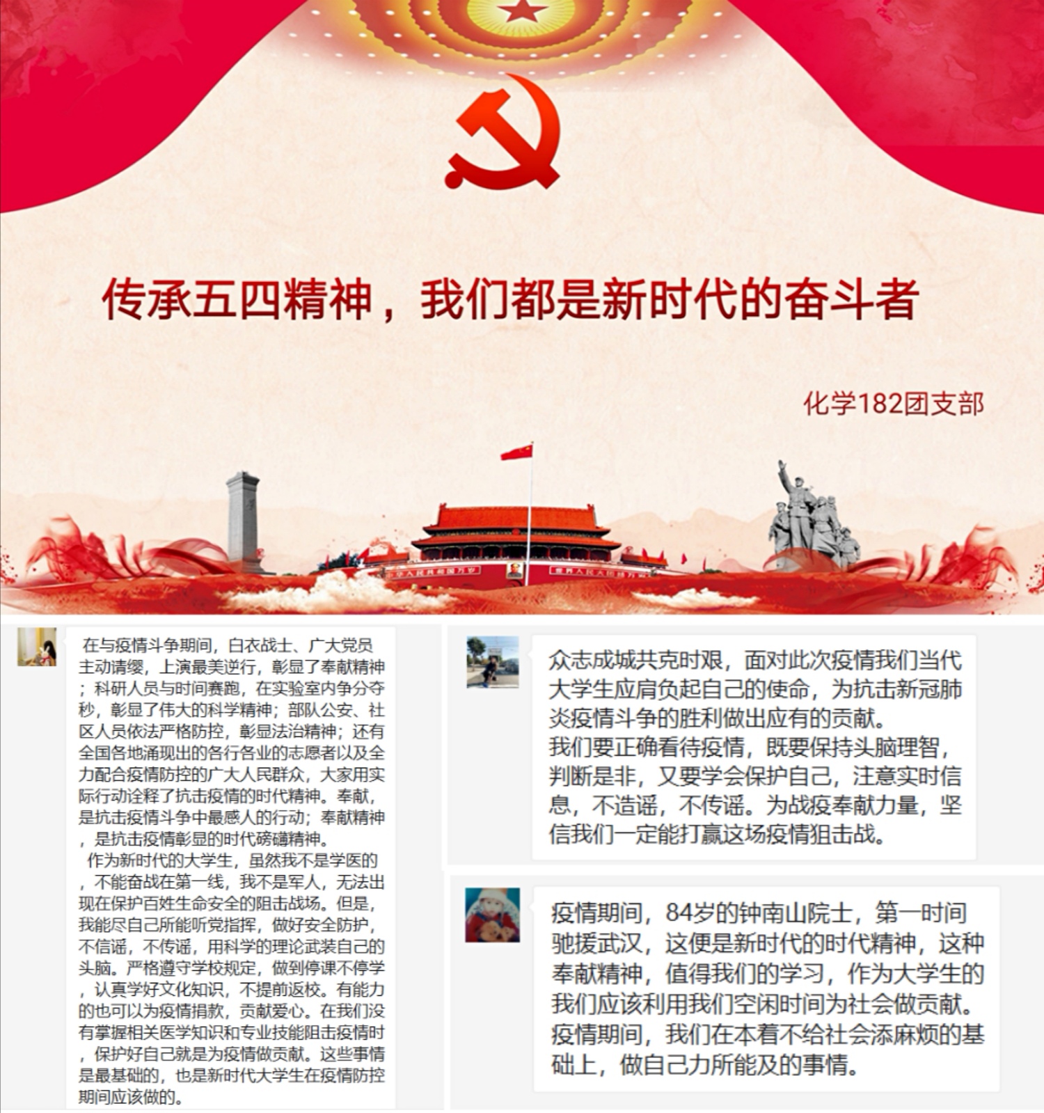 学校各级团委、团总支、团支部通过组织观看线上主题教育视频、学习团中央“五四青年节”特别团课、观看五四青年节特别节目《奋斗的青春最美丽》、开展“新时代的英雄精神和如何以实际行动传承五四精神”大讨论、以书法绘画作品致敬五四青春、以“奉献青春,强国有我”为主题开展了线上朗诵活动、开展网络互动、讲述身边的战“疫”故事等形式开展团日活动。