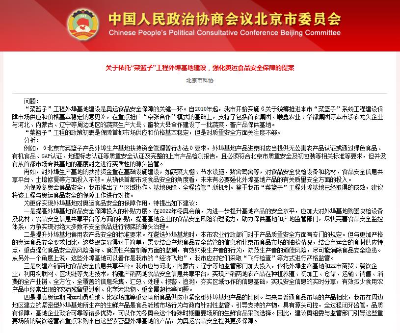 专业智库基地提交的《依托“菜篮子”工程外埠基地建设,强化奥运食品安全保障》政策建议,被北京市科协采纳并转化为中国人民政治协商会议北京市委员会第十三届三次会议团体提案。