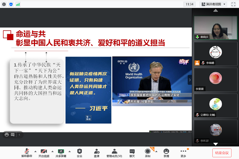 除七位校外导师外,我校的三位老师也加入云党课计划,为求实班学院贡献了精彩的课程。马克思主义学院葛学斌以全面建成小康社会为切入点,对党的十九届五中全会精神作了专业解读。工作保研辅导员张晨光通过对七首不同时期歌曲的解读,串联起了近百年来的时代记忆。学生工作部副部长盖晓庆阐述了伟大抗疫精神与中国优秀传统文化的联系与呼应,勉励各位党员同学在中华民族伟大复兴的征程中努力续写“中国红”。