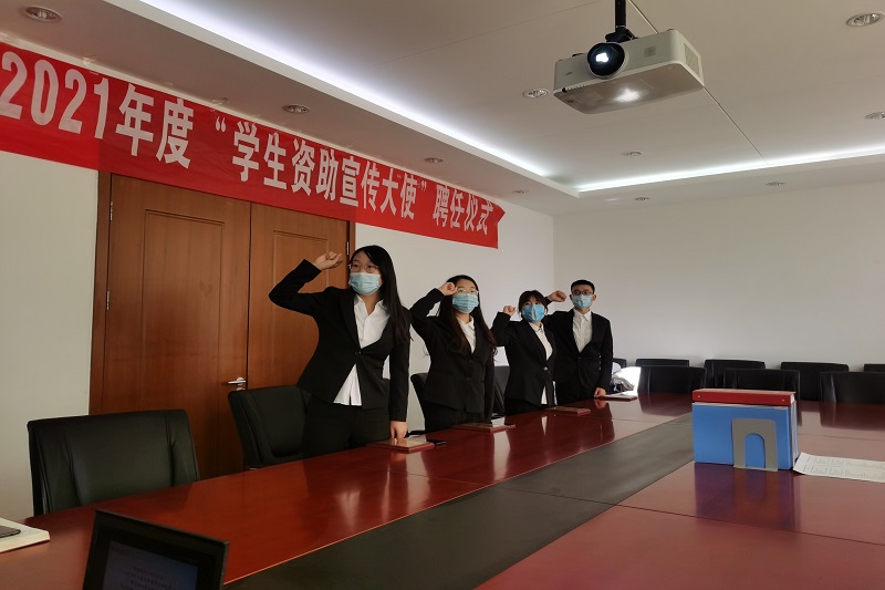 2021年度“学生资助宣传大使”招募工作开展以来,受到了同学们的广泛关注和积极响应,经由个人申请、学院推荐、资助中心组织考核答辩,共有25名品学兼优的国家奖学金、国家励志奖学金获得者成为2021年度“学生资助宣传大使”。会上,许峰宣读了《关于聘任2021年度“学生资助宣传大使”的决定》,吕良和许峰在两个会场分别为新聘大使颁发聘书。25名新聘大使庄严宣誓,立志为更多的贫困学子点燃希望,用真心、真情去传播爱的种子。