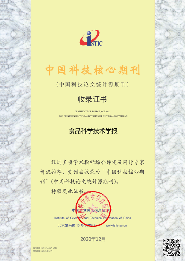 另据中国科学技术信息研究所发布的2020年版《中国科技期刊引证报告》,《食品科学技术学报》扩展影响因子上升为3.50,连续6年位列食品行业期刊第1名;刊物的其他各项评价指标稳居食品行业期刊前列,同时期刊继续入选“中国科技核心期刊”。中国知网发布的《2020中国学术期刊影响因子年报》显示,《食品科学技术学报》复合影响因子继续位列食品行业期刊第二名,再次入选中国学术期刊食品科学技术类影响力指数Q1区。