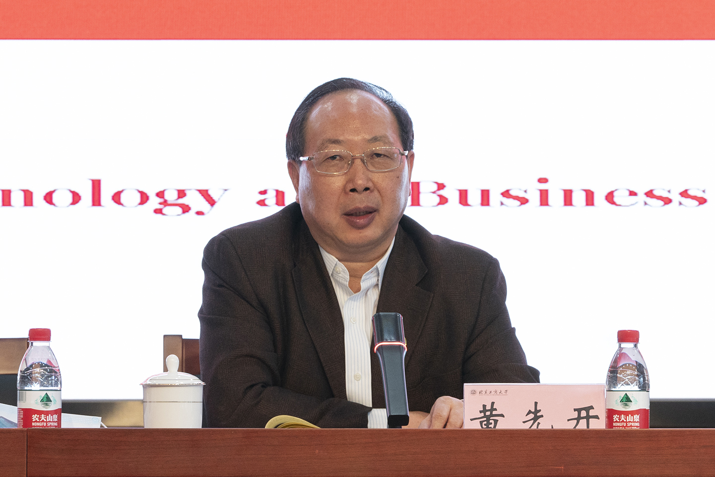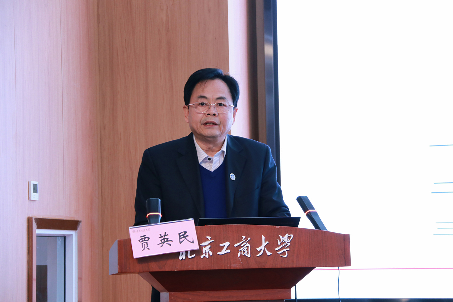 贾英民主持专题报告环节。经济学院院长倪国华、食品与健康学院院长王静、商学院院长毛新述分别对应用经济学、食品科学与工程、工商管理三个高精尖学科的建设情况进行了汇报。国家级线上一流课程负责人宋焕禄教授和北京高校思政理论课特级教授王鲁娜分别以《精耕细作,扎实推进,论一流线上课程建设》和《课程思政与思政课程协同育人的探索与思考课》作了专题报告。