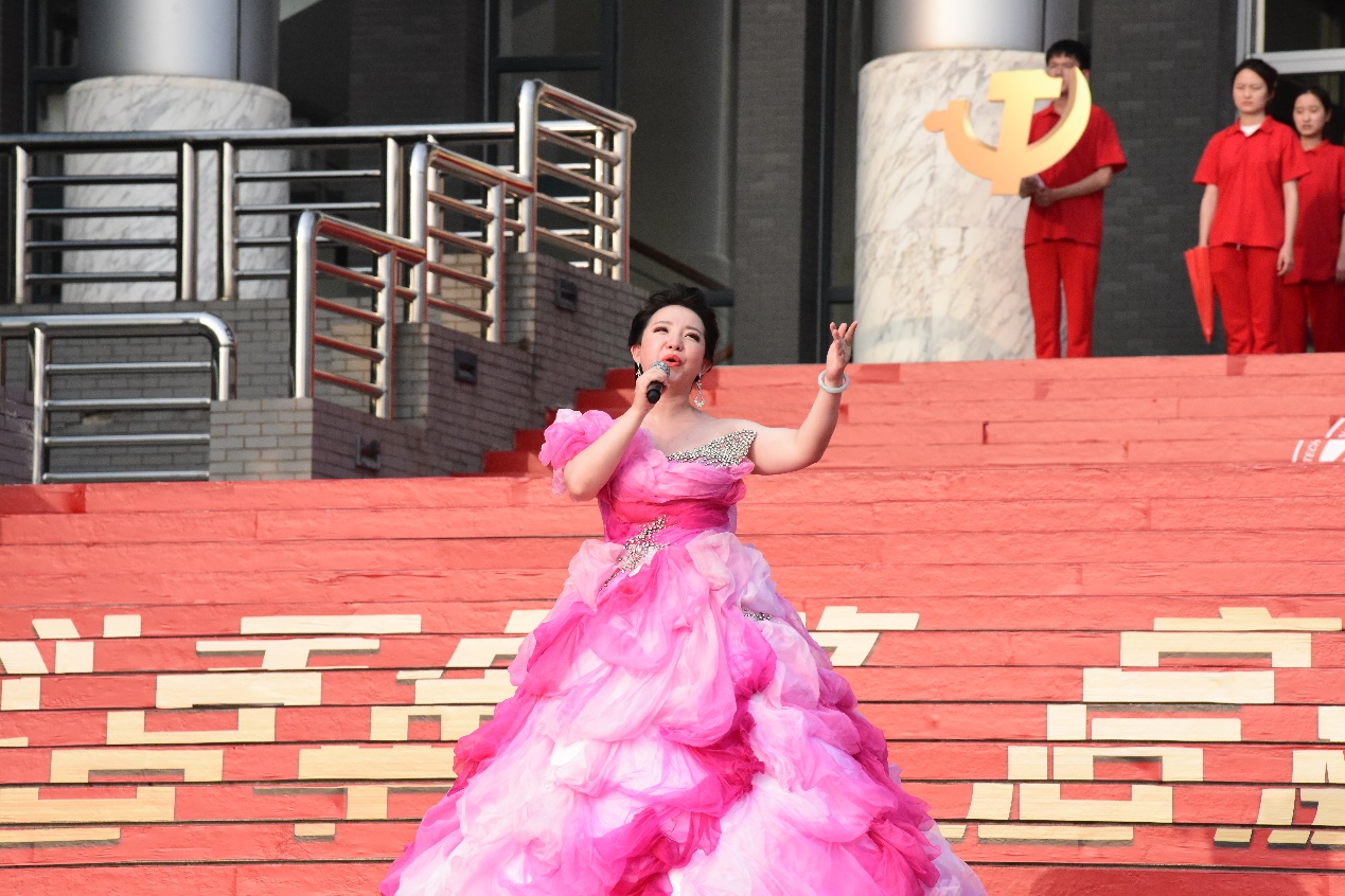 傍晚6时整,图书馆前成了一片红色的海洋,20米红色巨布铺满三层长阶, 镌刻着“1921-2021”的字样和金色红船的图案,营造成热烈而浓郁的氛围,让现场师生联想到从上海石库门到嘉兴南湖,一艘小小红船承载着人民的重托、民族的希望,越过急流险滩,穿过惊涛骇浪,航行百年,成为领航中国行稳致远的巍巍巨轮。伴随着管乐器吹奏着《唱支山歌给党听》悠扬乐曲,刚刚下课的同学们三三两两,纷纷循声汇聚到图书馆前。管弦乐曲罢,领唱体育与艺术教学部丁璇用动听而又极富感染力的歌声唱响《我爱你,中国》,歌声里满是对祖国未来的憧憬和对党百年征程的歌颂。红色长阶上数十名舞者身着白衣红裙翩翩起舞,妙态绝伦。二十五个智能舞蹈机器人摆成党徽的形状,跟着歌声的节奏跳动,整齐划一,灵动的舞姿和可爱的形象俘获了现场师生的心,象征着北工商学子整装待发,开启百年新征程的意志。人工智能学院的“NAO”机器人矗立在舞蹈机器人的前方,指引方向,代表着工商青年坚定信心跟党走,始终坚持中国共产党领导的信心。