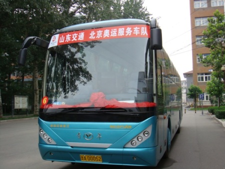7月17日17:30,一辆贴有“山东交通北京奥运服务车队”字样的崭新的德国尼奥普兰高级客车开进我校校园。这是山东奥运服务车队首辆车进驻我校。到八月初,山东交运集团将有14辆车进驻我校,为我校志愿者的赛时用车提供保障。